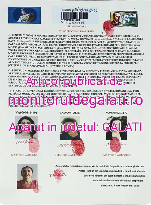 Io femeia viecu drepturi rezervate ȋnștiințez public aici și acum statutul și competența ne-cedate dar și revendicate la data deprin proclamarea suveranitații individuale EXEMPT validată consimțita și recunoscută de poporul viu nativ al acestui teritoriu care conține 3 (trei) Acte 1-Revendicare 2-Declarație de viu ȋn viață suverană 3-Affid-Avit, acte ce sunt la termen cu Ritul Mandamus și Ritul Probatum Regnum număr evidența publică 98321033123501004 și 983210341748240014 publicate 08 August 2023 cu valabilitate ȋncepând cu 10 August 2023. Astfel declar public suveranitatea mea individuală EXEMPT si “nunc pro trunc” iar dacă nimeni nu contestă cu dovezi clare cele publicate de mine la termen 30 zile de la publicare ce am scris devine lege conform regulei de aur din Ritul Mandamus și Probatum Regnum a Papei de la Vatican.