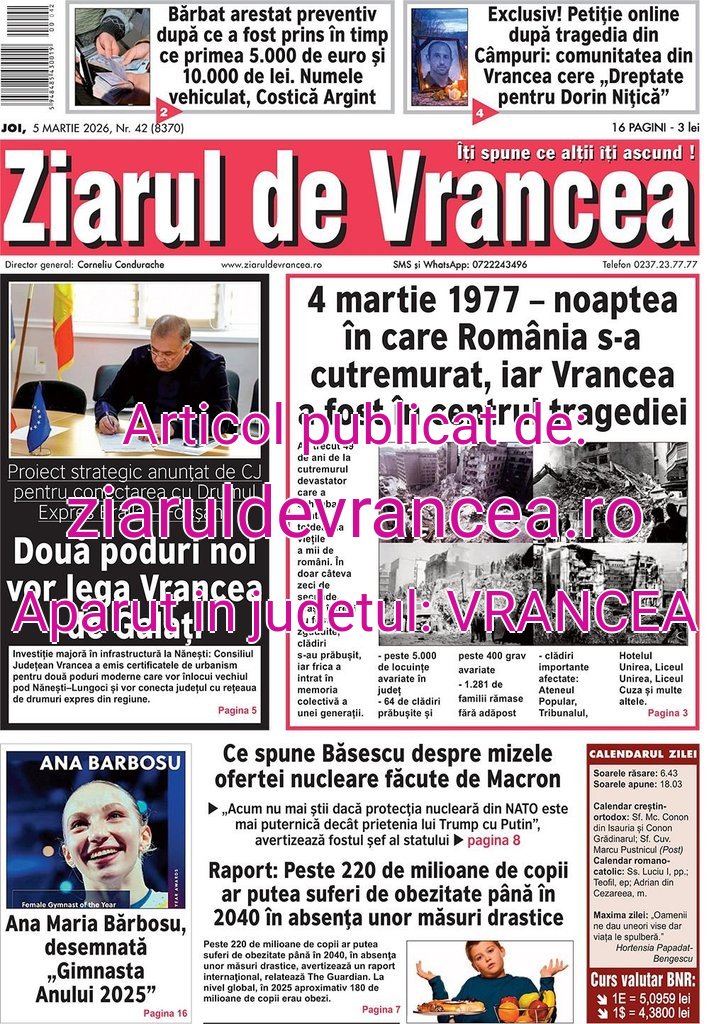 Noua ediție de joi, 5 martie a cotidianului Ziarul de Vrancea propune cititorilor o sinteză a celor mai importante subiecte ale momentului pentru județul Vrancea: proiecte majore de infrastructură care ar putea conecta județul la Drumul Expres Brăila–Focșani, rememorarea cutremurului devastator din 4 martie 1977, performanțe sportive remarcabile și teme de interes național și internațional cu impact asupra României.