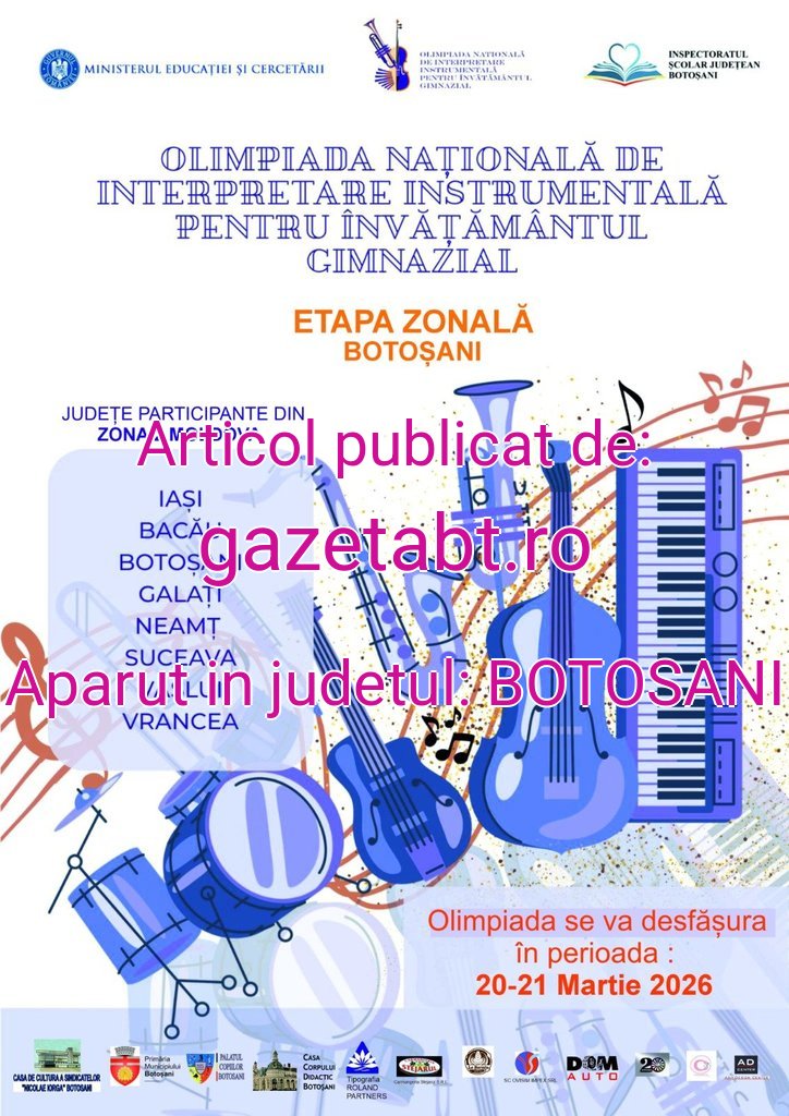 Inspectoratul Școlar Județean Botoșani organizeazăOlimpiada Națională de Interpretare Instrumentală, etapa zonală, un eveniment de prestigiu ce va avea loc în municipiul Botoșani, vineri,20 martie 2026, începând cu